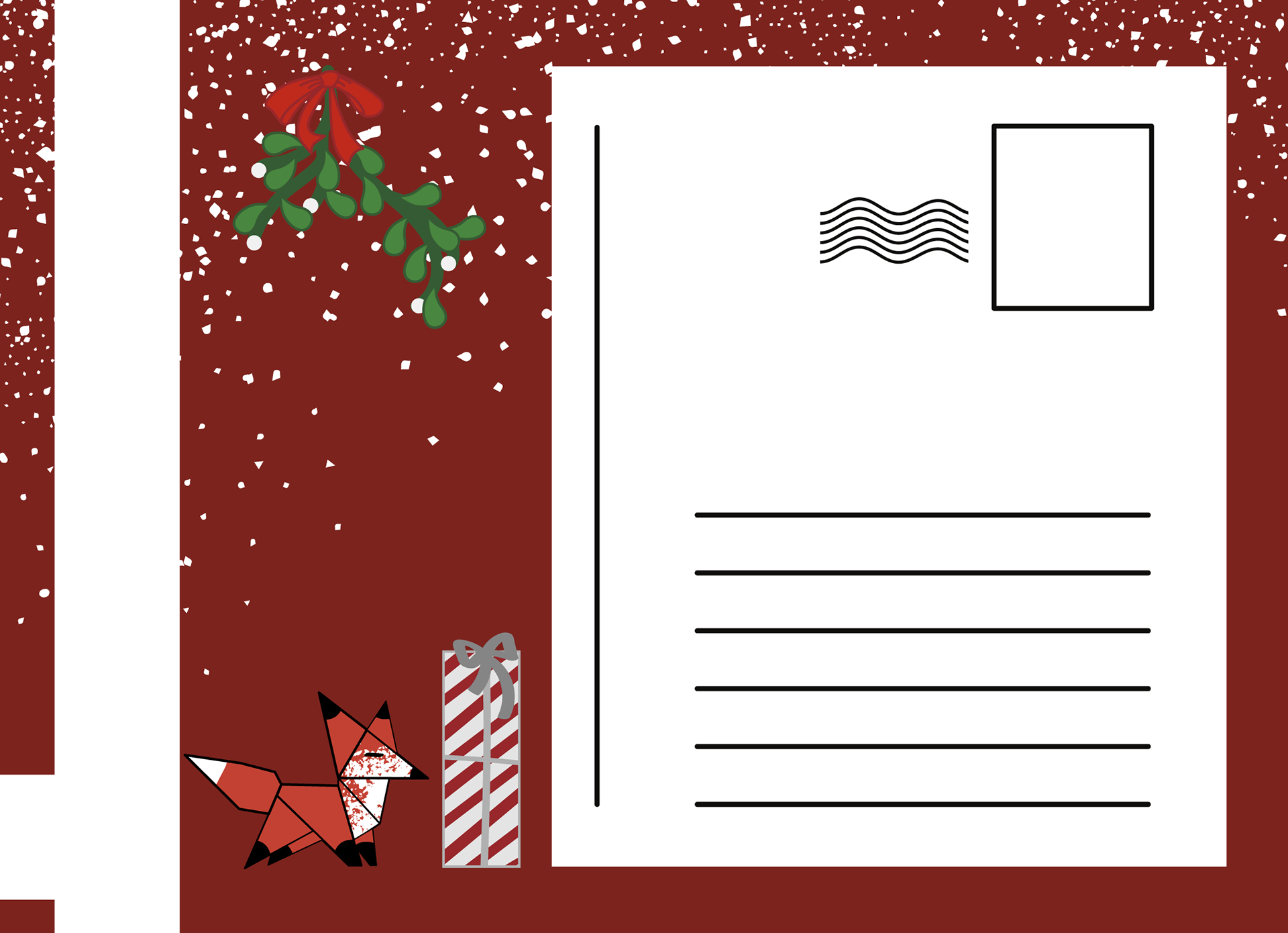 Made in Adobe Illustrator, 2024. I made this origami foxes postcard for the Christmas season.
